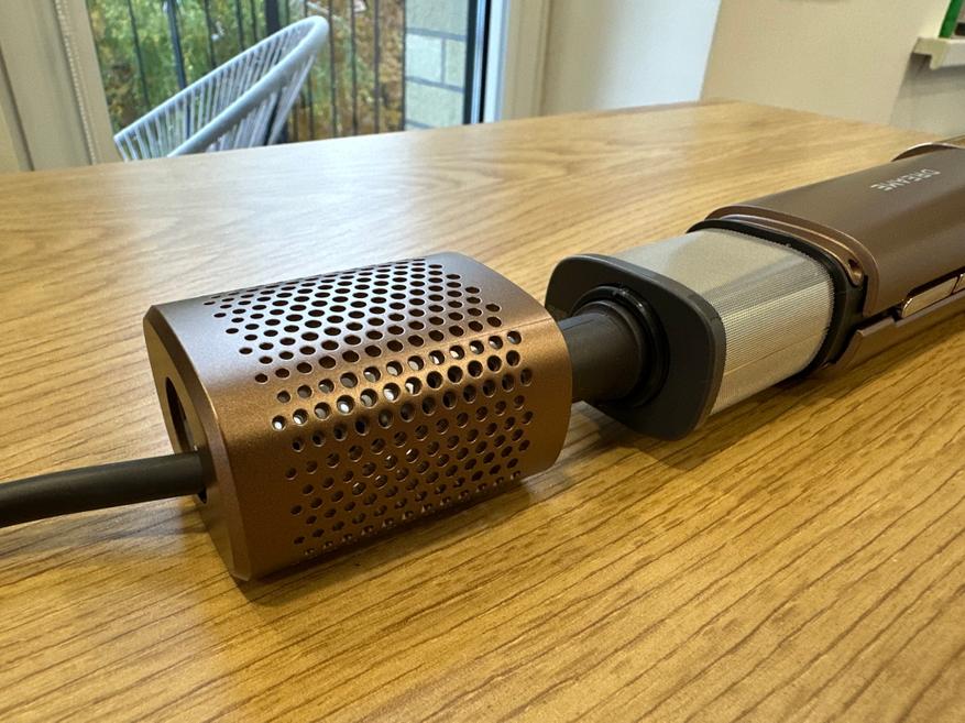 Отдельного упоминания заслуживает система фильтрации воздуха. В нижней части рукоятки видна металлическая решетка с перфорацией, за ней скрывается съёмный цилиндрический фильтр. Конструкция продуманная: двойная структура с внешней сеткой и внутренним слоем, защищающим от пыли и волосков. Снимается он легко, без усилий, что особенно удобно при регулярной чистке.