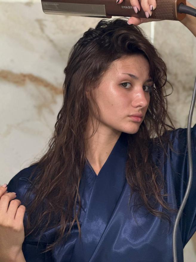 Еще один день в тестовом режиме. На это раз использую режим Wet. Его я отложила на вечер, хотела спокойной обстановки, чтобы почувствовать разницу. Волосы подсушила полотенцем, чтобы не стекала вода. Включаю прибор, выставляю минимальную скорость, среднюю температуру, и первые секунды прислушиваюсь — ровный, мягкий звук, похожий на фен, но без визга. Направляю поток вниз по пряди, и сразу чувствую, как воздух проходит сквозь волосы, не пересушивая, а будто «вытесняя» влагу наружу. На первых прядях немного волнуюсь, все-таки сушу утюжком впервые, но тревога быстро уходит. Поток сильный, равномерный, не пульсирует. При более медленном движении тепло остается комфортным, волосы не становятся горячими на ощупь. На высокой скорости сушка идет быстрее, но требует чуть большего внимания — воздух ощутимо сильнее, и прядь нужно натягивать плотнее. Такая мощная настройка, как мне кажется, идеально подойдет для густых длинных волос. После пары прядей становится понятно, что привычная суета с феном и брашингом здесь не нужна. Двигаюсь сверху вниз, волосы разглаживаются сразу, без ощущения пересушенности. Прядь выходит гладкой, но не «прилизанной» — живой, подвижной. К концу укладки включаю холодный обдув (удержанием кнопки), и воздух действительно прохладный, не просто «чуть менее горячий». Волосы остывают, форма закрепляется, концы становятся более четкими. Весь процесс занимает меньше времени, чем я ожидала.