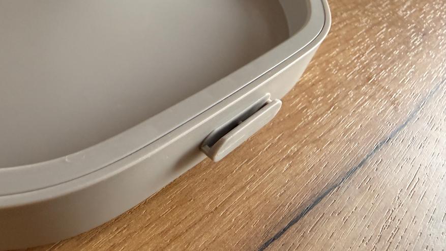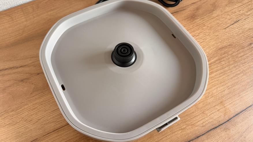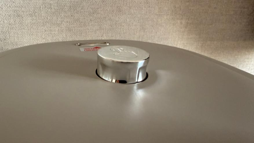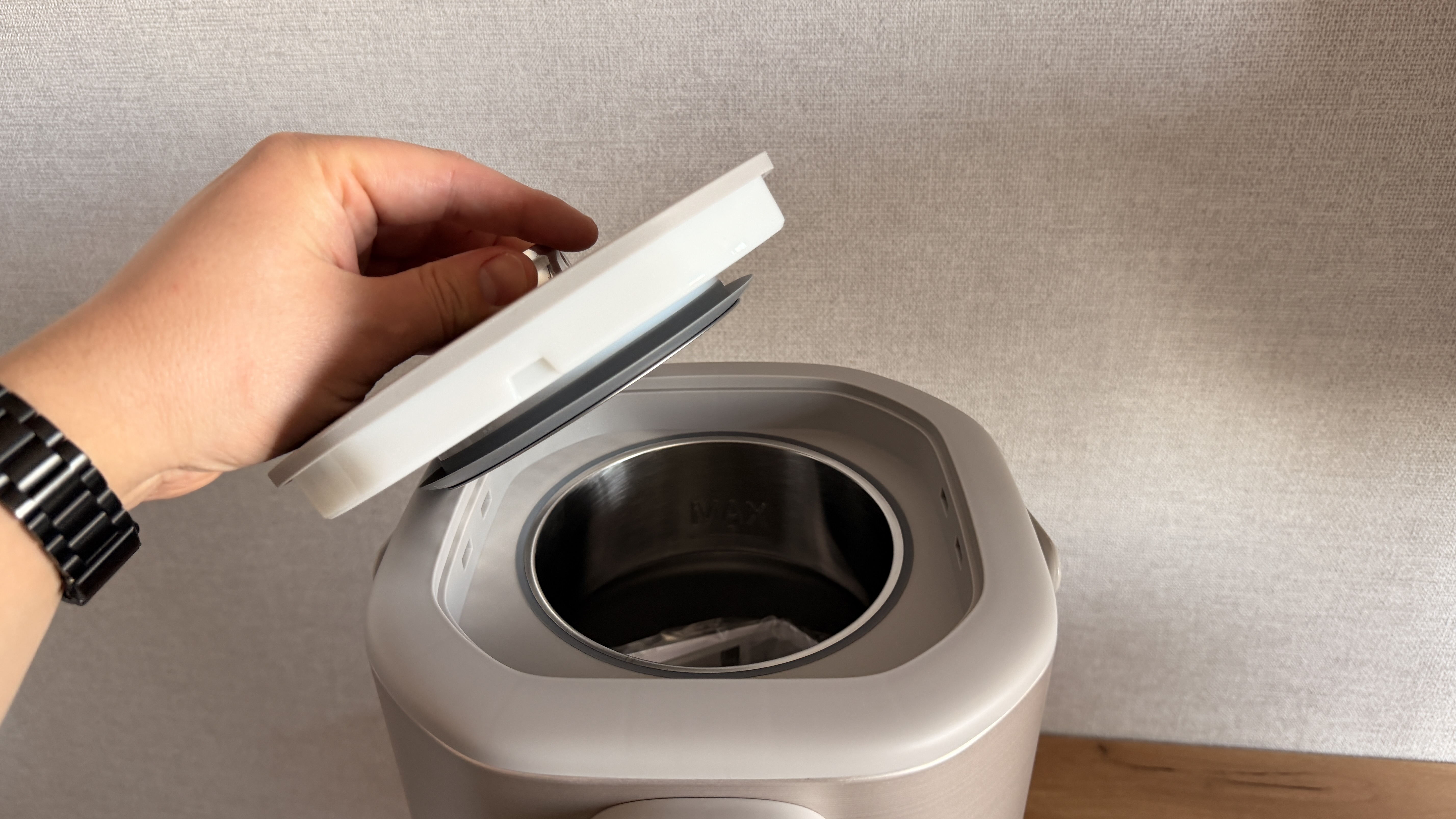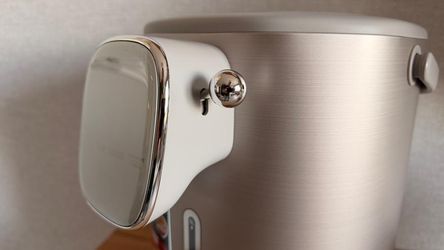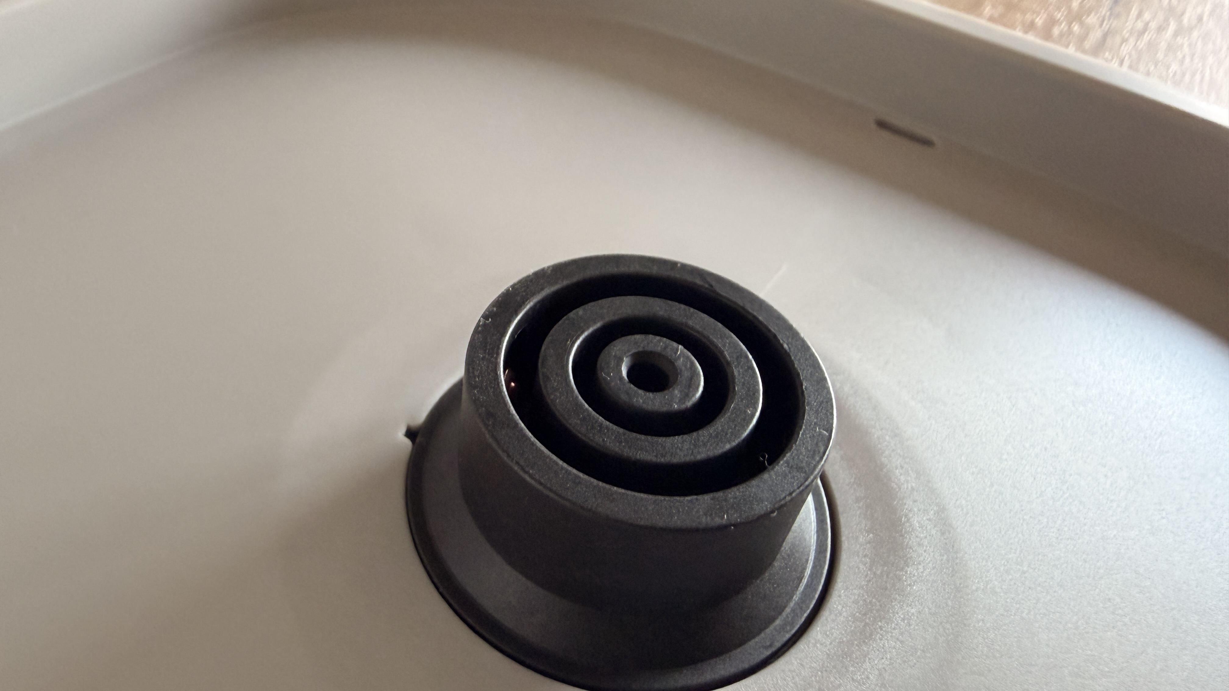Сверху термопот прикрыт крышкой. Очень удобно, что она съемная. Нажимаем на хромированную кнопу по центру, она выезжает по системе Push To Open, затем за нее легко снять крышку. Крышка устанавливается через силиконовые уплотнители, чтобы термопот имел функцию термоса. Крышка так же имеет пароотводящее отверстие.