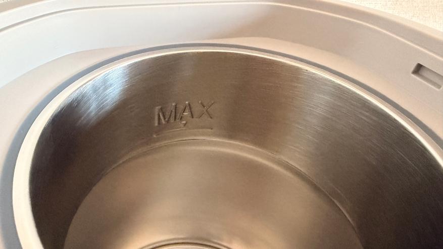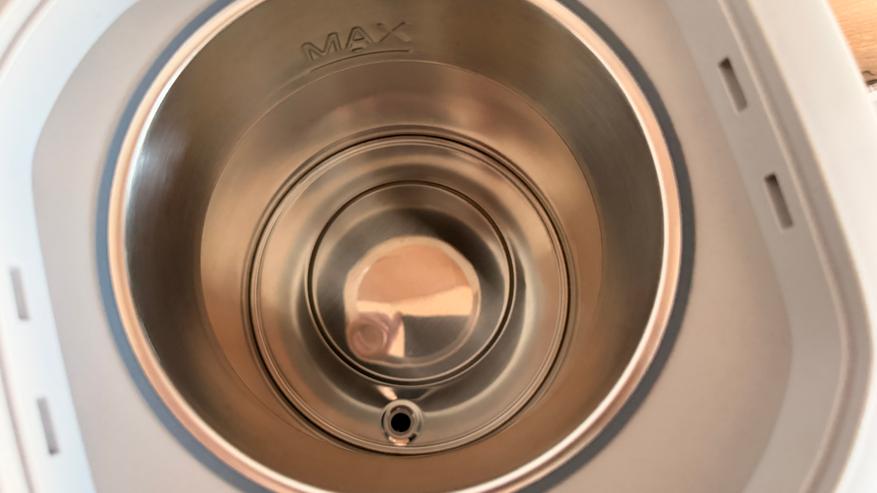Заглядываем вовнутрь термопота. Тут чаша из нержавеющей стали с указателем максимального уровня и отверстием для забора воды, снабжённым сетчатым фильтром.