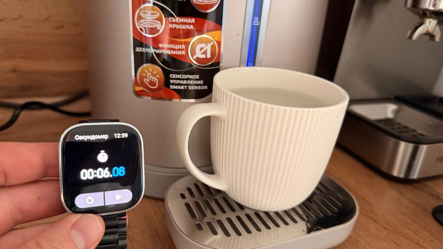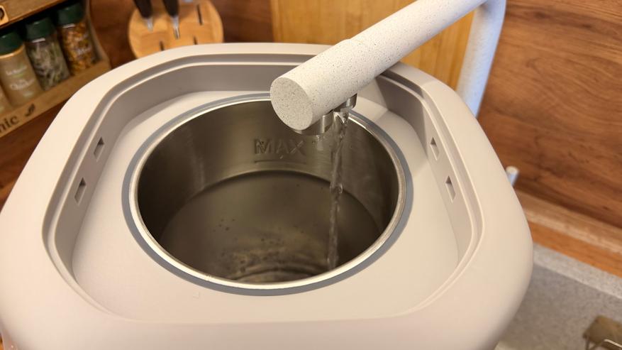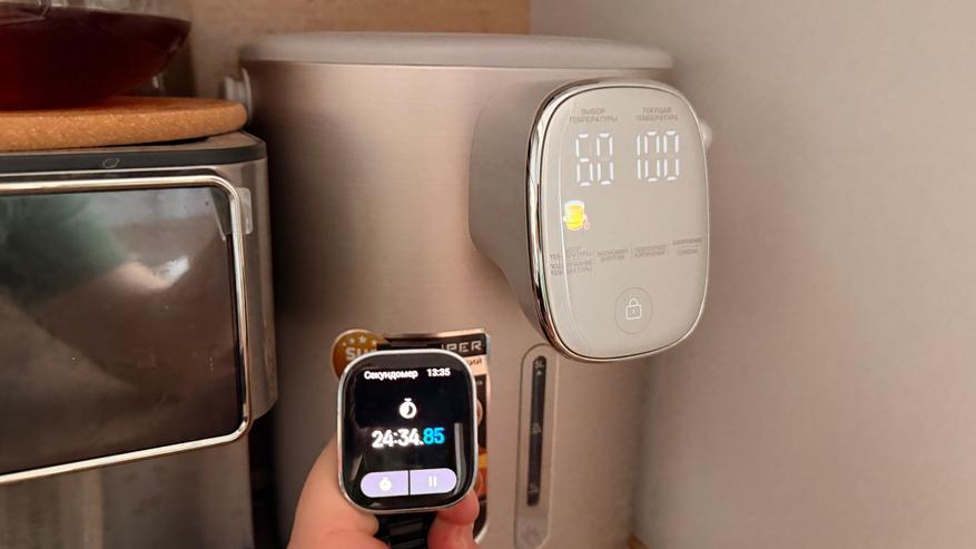 Еще сам налив воды при помощи помпы довольно шустрый. Чашка 300 мл набирается за 6 секунд. Налив происходит двумя способами. Можно нажать на рычаг справа один раз — начинается налив, и нажать еще раз — заканчивается налив (актуально для больших емкостей, например термос). А еще можно просто наливать воду, пока держишь рычаг нажатым. Кипячение от 20°С до 100°С занимает 24 минуты. Во время кипячения термопот потребляет 1187 Вт электроэнергии.