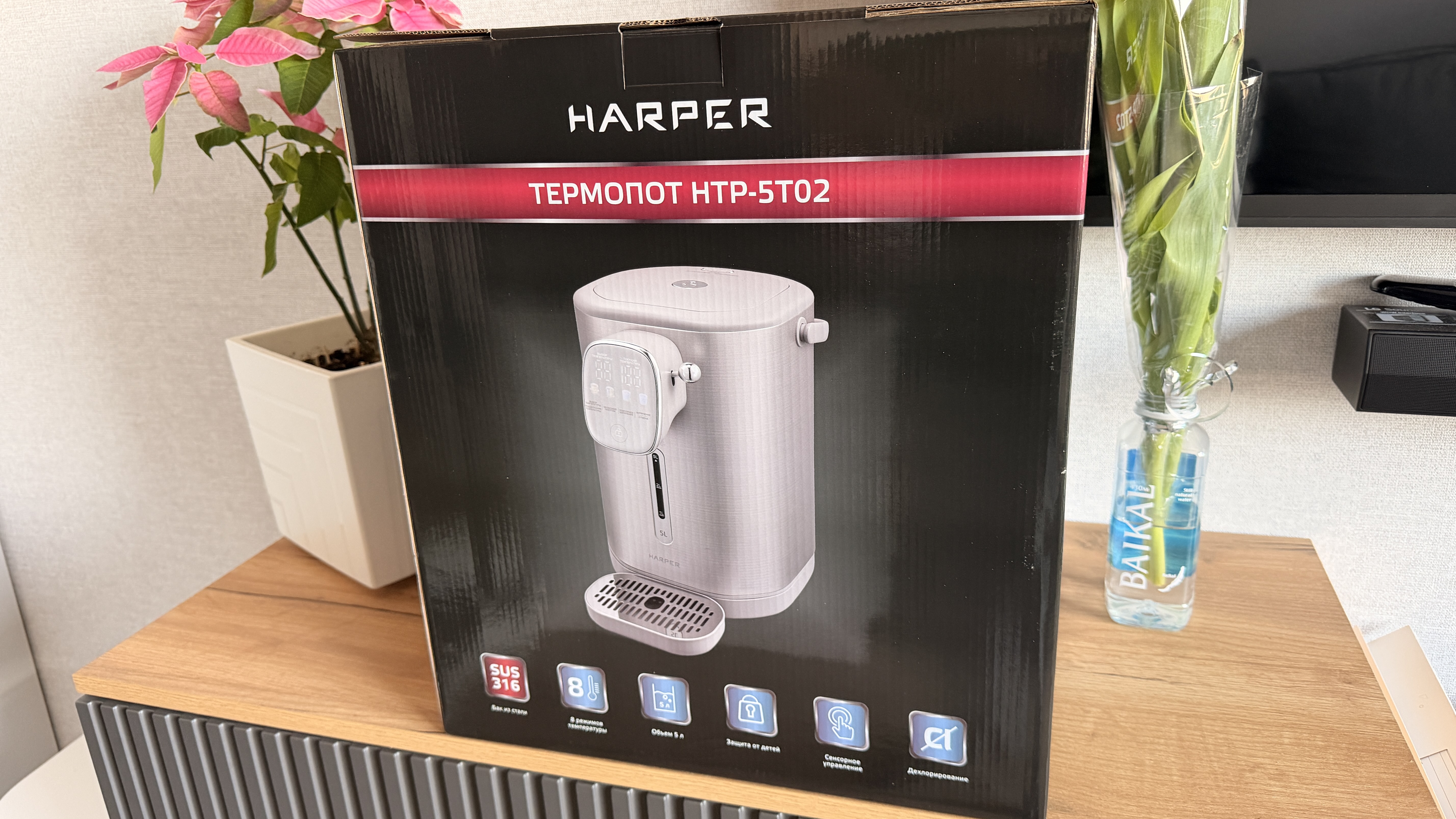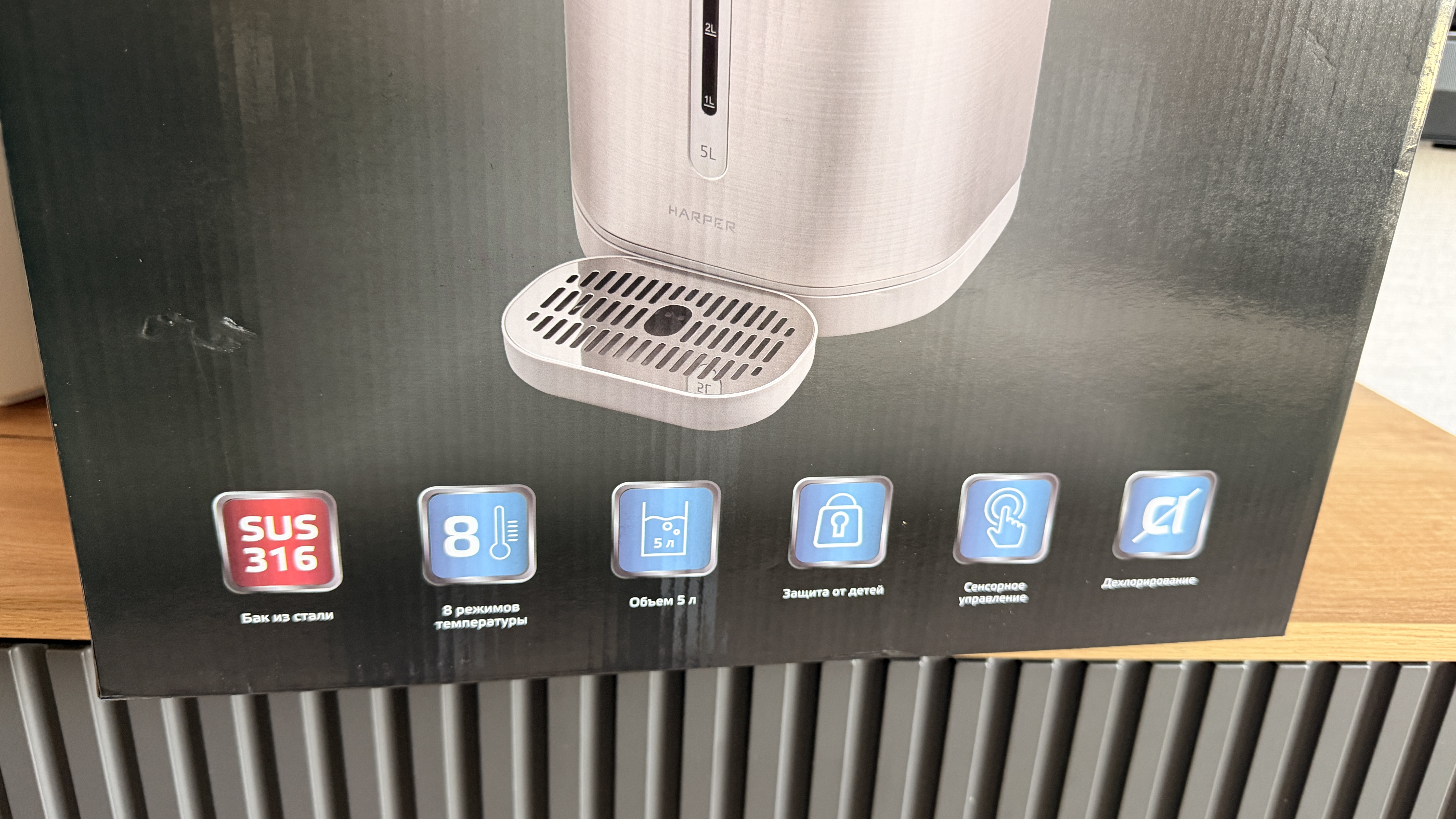 Вся продукция компании Harper упакована в узнаваемые коробки. Тут и изображения внешнего вида товара, и все расписанные преимущества. Основные преимущества модели: сталь бака SUS 316, сенсорное управление, блокировка от детей, дехлорирование, съемная база.