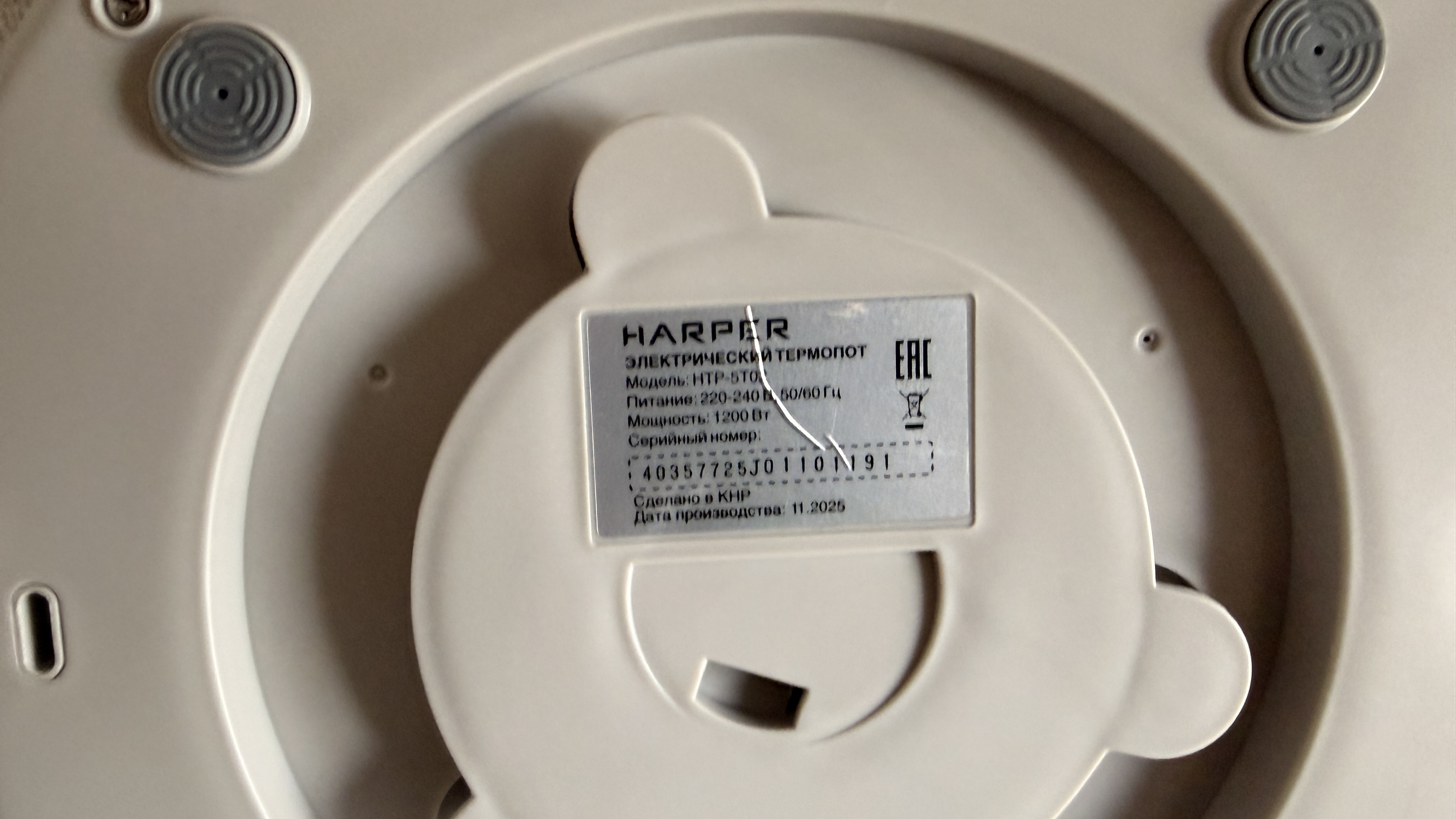 Преимущество этого термопота — это съемная база. Можно спокойно снимать его с базы и нести для набора воды в мойку. На нижней части термопота смотка кабеля (длина 1.2м, евро-вилка) и наклейка с параметрами модели. База и термопот соединяются по примеру классических электрочайников, даже контактная база точно такая же. На передней стороне базы есть кронштейн для крепления поддона.