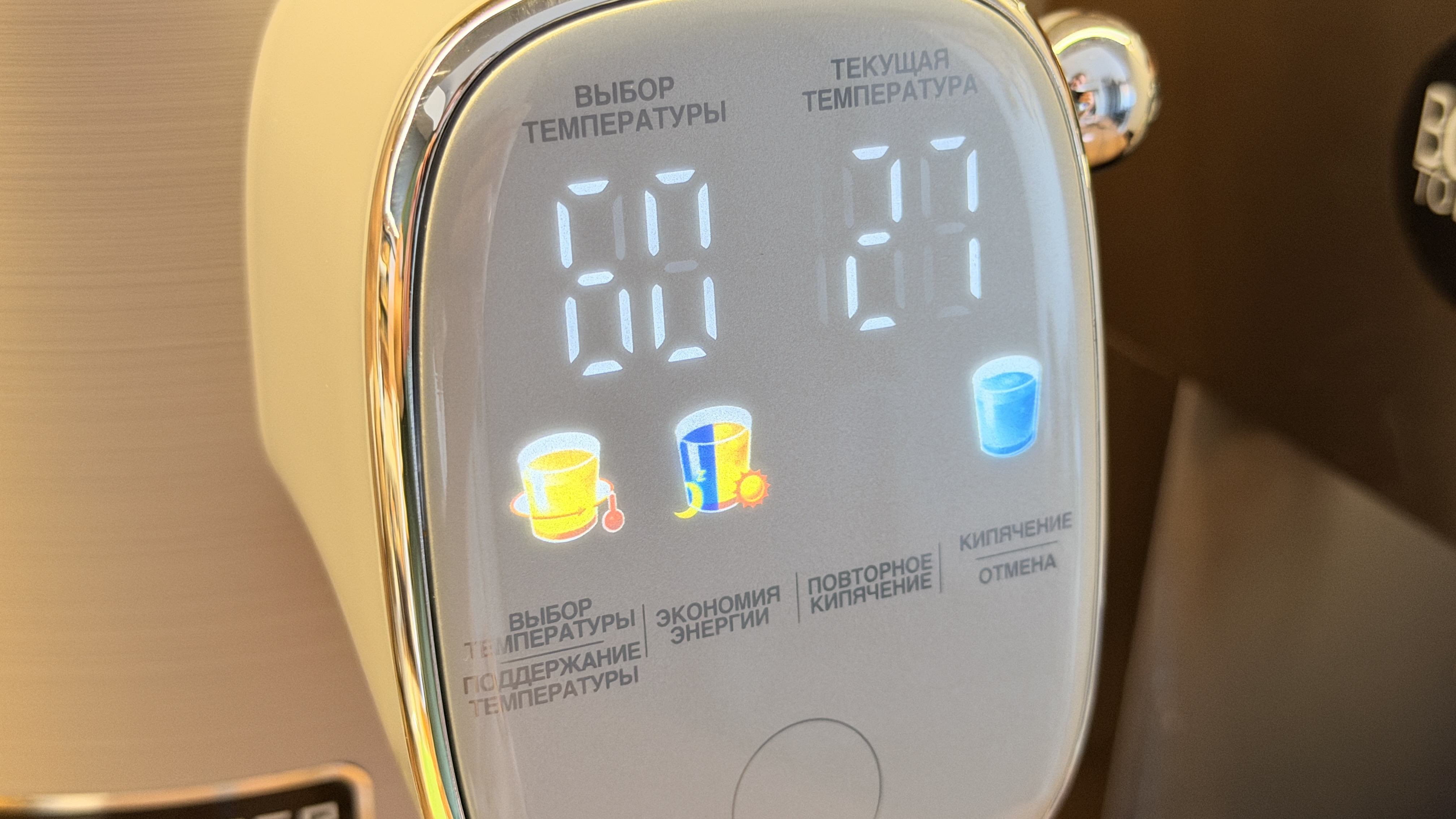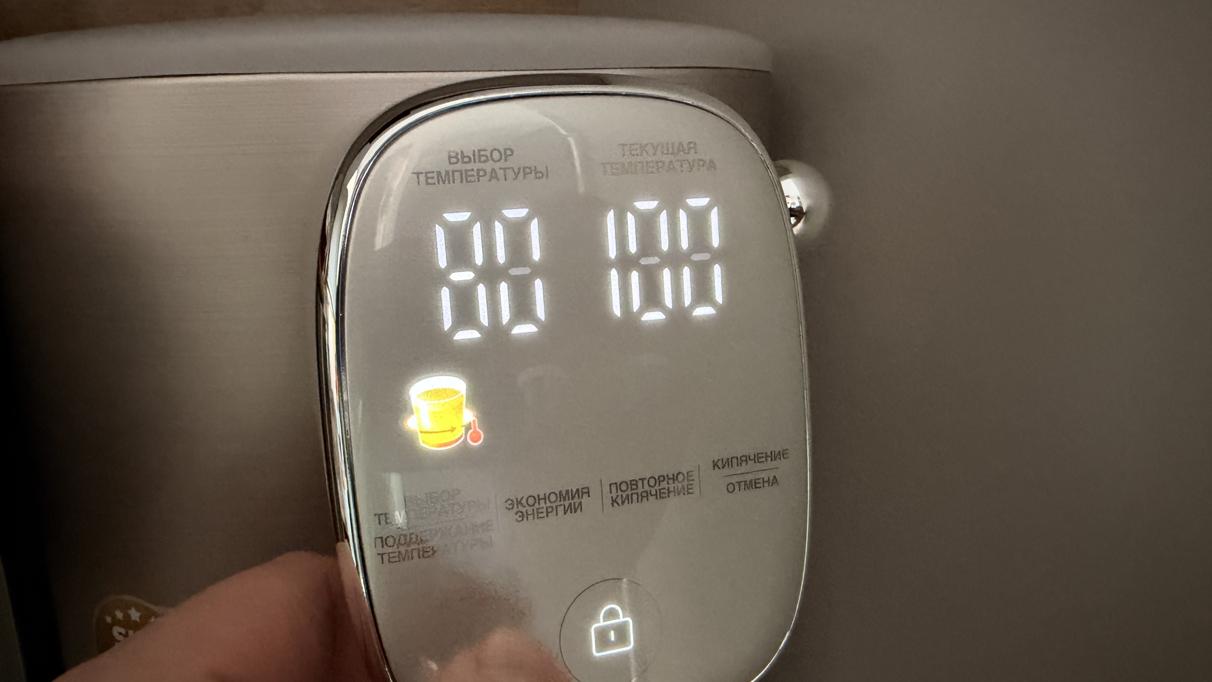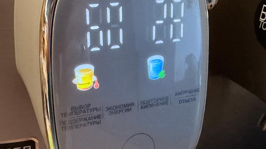 Подаем питание, загорается подсветка дисплея. Все иконки режимов современные, цветные, сенсорные кнопки русифицированы. В левой части термопот показывает задание температуры для нагрева воды, с правой текущую температуру, ниже иконки выбранного режима.