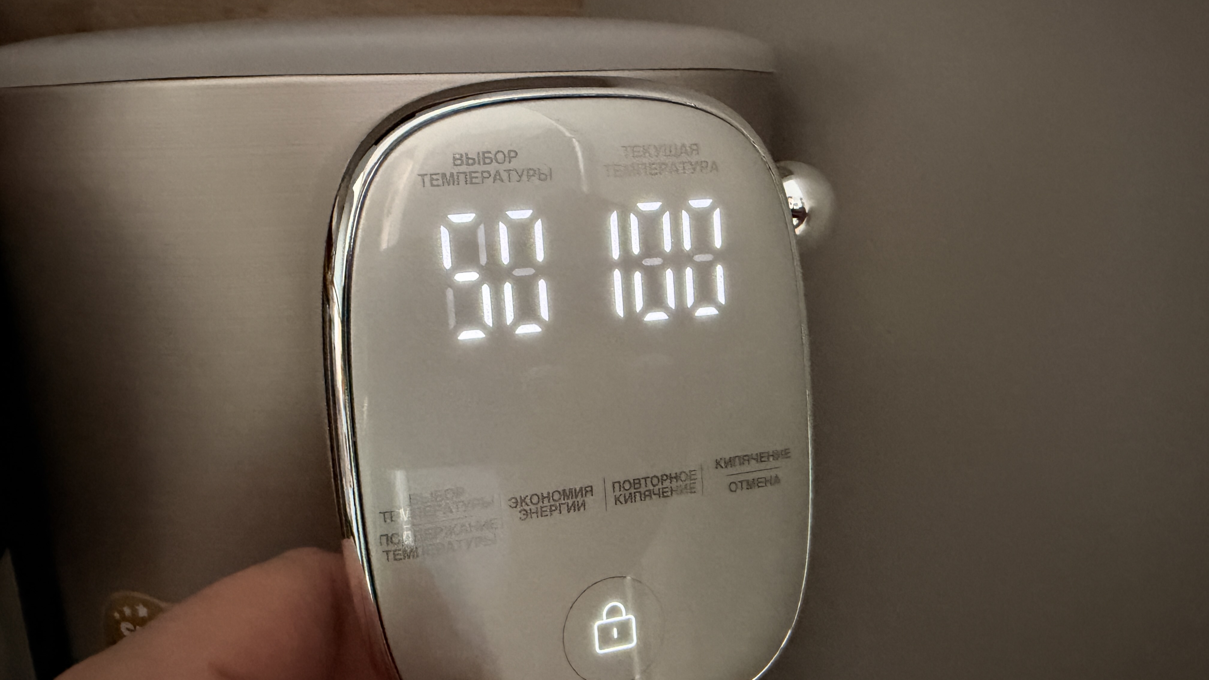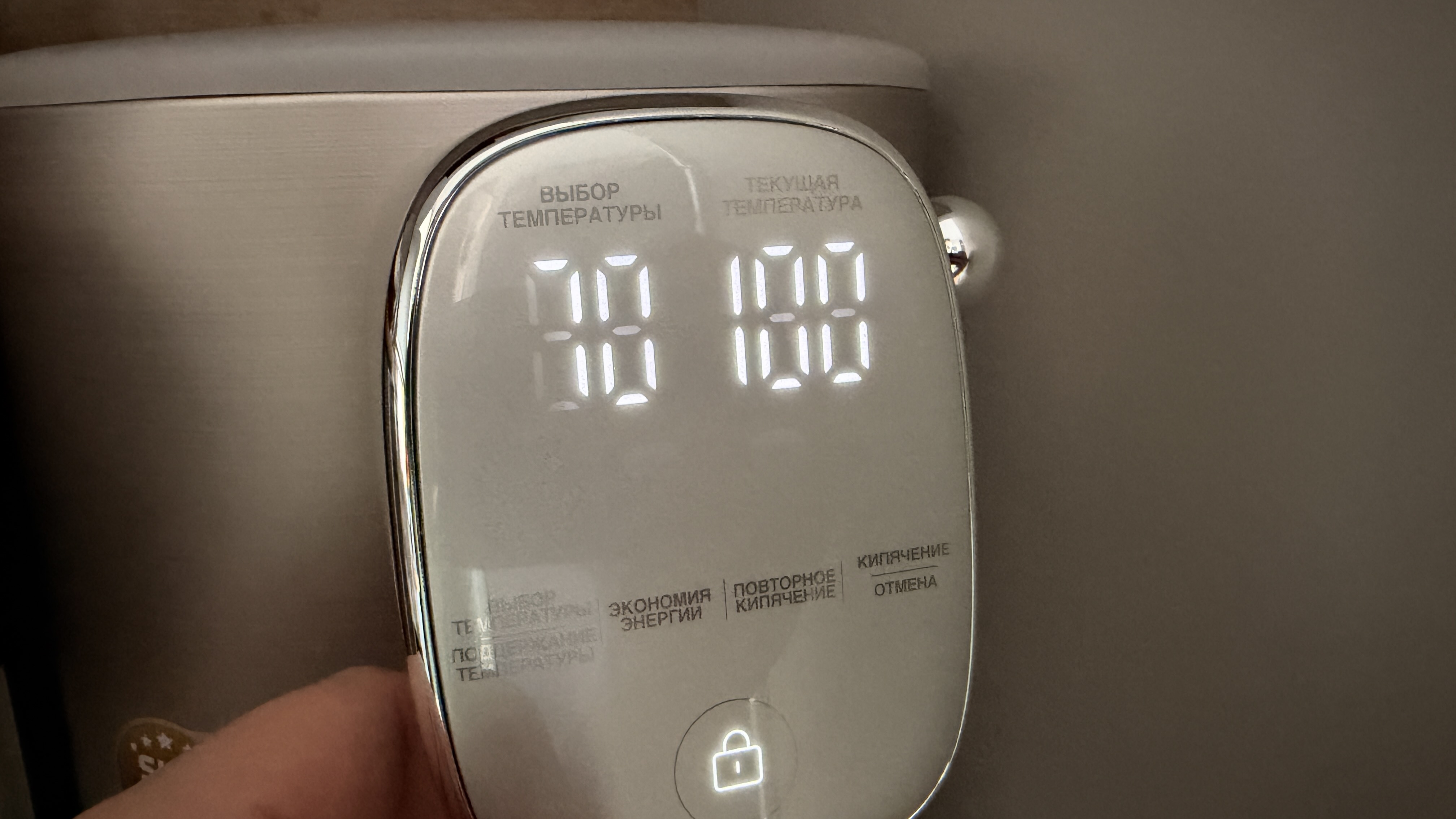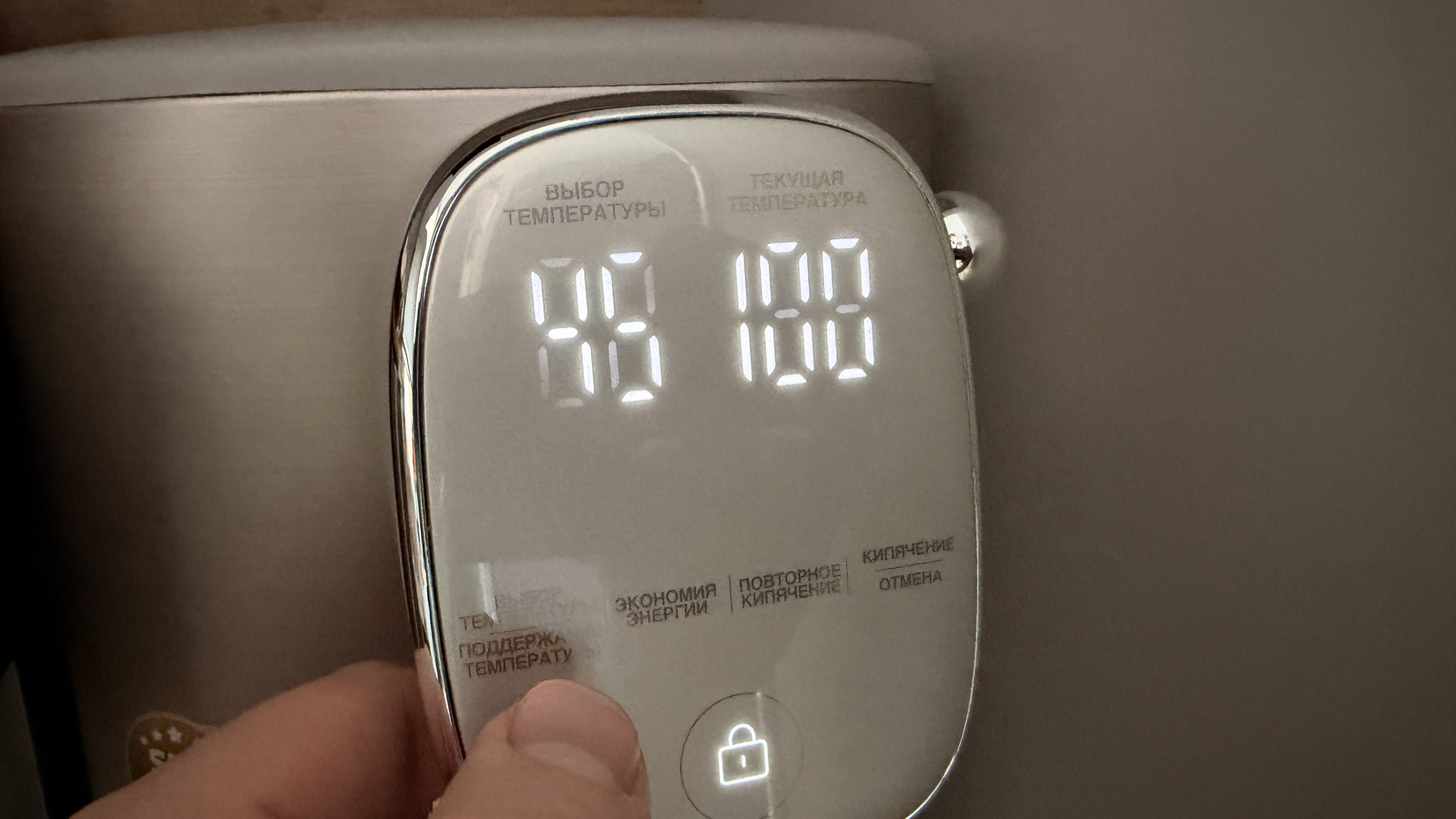 Подаем питание, загорается подсветка дисплея. Все иконки режимов современные, цветные, сенсорные кнопки русифицированы. В левой части термопот показывает задание температуры для нагрева воды, с правой текущую температуру, ниже иконки выбранного режима.