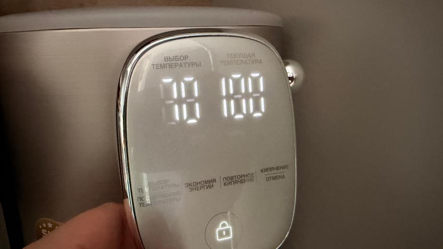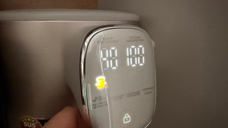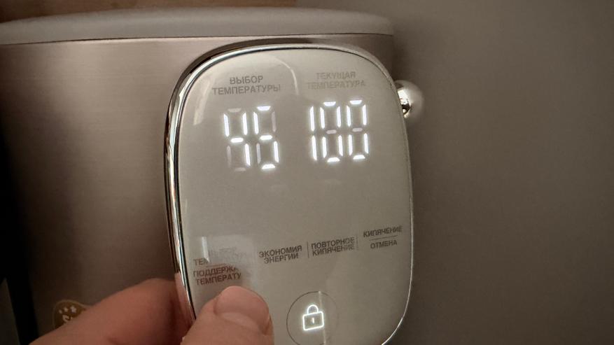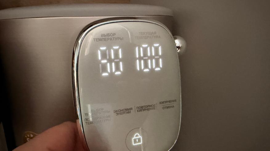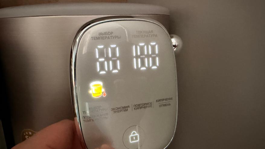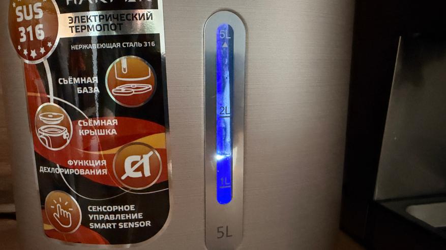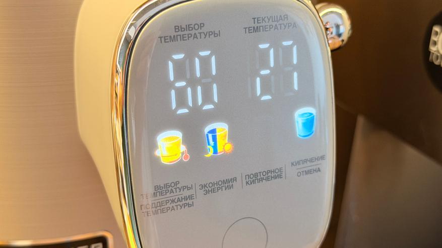 Режим дехлорирования достигается нажатием кнопки повторное кипячение после достижения 100°С. Экономия энергии — это режим, отключающий нагрев ночью, когда не будет внешнего освещения, тогда термопот перейдет в режим термоса. Шкала после нажатия любой кнопки или подачи воды подсвечивается приятным свечением.