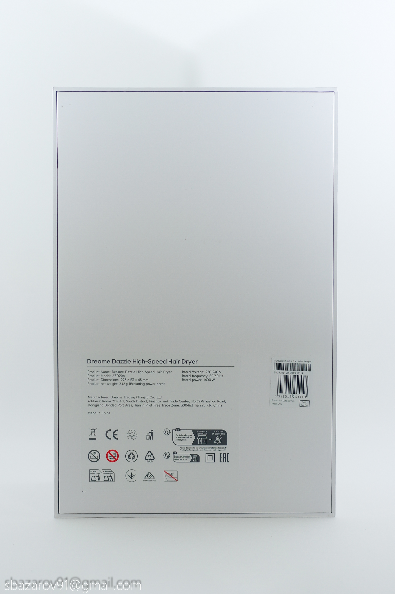 Если снять вкладыш, то перед нами обычная коммерческая упаковка в минималистичном стиле, где изображен внешний вид фена и его технические характеристики.