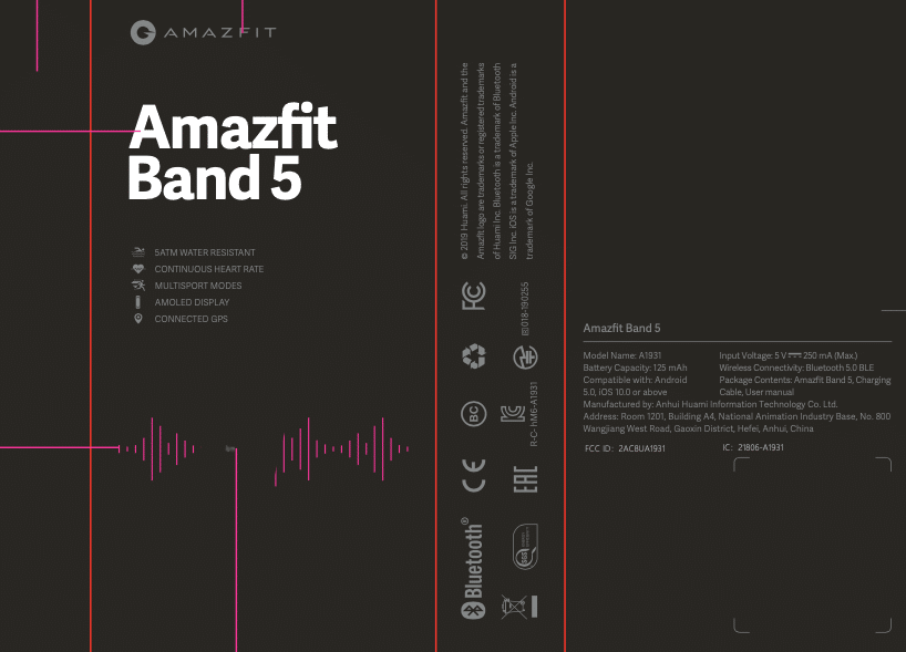 Amazfit Band 5, как мы теперь знаем благодаря сайту FCC будет оснащён аккумулятором ёмкостью 125 мА·ч, дисплеем AMOLED, датчиком ЧСС и получит защиту от воды (5 ATM). Также он сможет использовать GPS с сопряжённого смартфона.