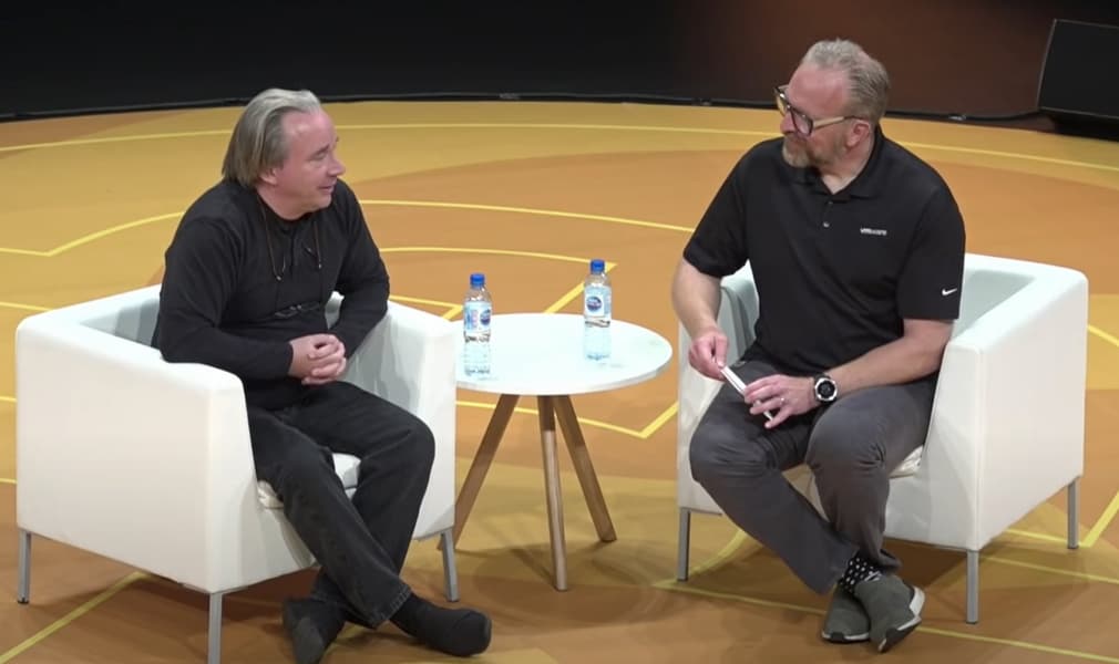 Линус Торвальдс (Linus Torvalds), легендарный отец-основатель Linux, побеседовал с вице-президентом VMware Дирком Хонделом (Dirk Hohndel) на конференции Open Source Summit/Embedded Linux Conference Europe.