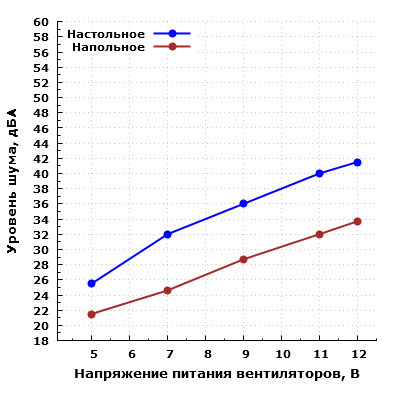 При большем удалении корпуса от пользователя и размещении его, к примеру, на полу под столом, шум можно будет охарактеризовать как минимально заметный при питании вентиляторов от 5 В, а при питании от 12 В — как средний для жилого помещения в дневное время суток.