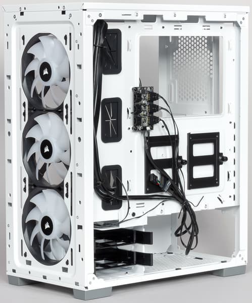 Все остальное тут в современном тренде: спереди — решетка, сбоку — стекло. Разноцветная иллюминация также имеется — и более того, наличие системы iCue является одной из ключевых особенностей данного корпуса.