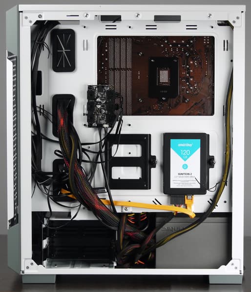 Порядок сборки ПК в данном корпусе особого значения не имеет, так как компоненты разнесены и не мешают друг другу, но лучше начать с установки блока питания и прокладки проводов.