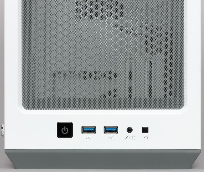 В передней части верхней панели размещены органы управления и коммутации. В их состав входят: два разнесенных друг от друга примерно на 8 мм порта USB 3.0, комбинированный разъем для подключения микрофона и наушников, большая квадратная кнопка включения, круглая кнопка перезагрузки. Индикатор включения находится внутри квадратной кнопки и имеет белое свечение.