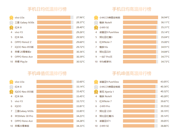 Лидером по «холодности» смартфонов оказался бренд Vivo, обошедший других производителей со средней рабочей температурой в 30,56℃. Показатели остальных брендов превышают 31 градус. На втором месте идёт Samsung с 31.08℃, на третьем — Oppo 31,15℃, затем Huawei 31,17℃, Smartisan c 31,37 ℃ и Honor c 31,49 ℃, Xiaomi с 32,45°C, а также Realme с 33,18°C. Redmi, iQOO, Nubia, OnePlus и Nokia другие бренды в Топ-10 не вошли.