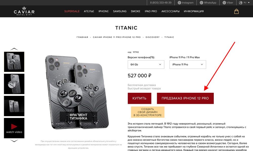Конечно, все эти версии iPhone, над которыми потрудились дизайнеры Caviar, стоят совсем недёшево. Самый «доступный» вариант предлагается за 174 тысячи рублей с учётом действующей скидки в 30%. А самый дорогой вариант обойдётся дороже 6 миллионов рублей.