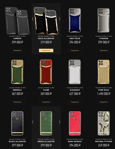 Для отделки компания использует золото и серебро высшей пробы, драгоценные камни, экзотические виды кожи, титан и карбон. Caviar предлагает собственные версии iPhone 12 Pro и Pro Max с полным набором сопутствующих аксессуаров: блоком питания для зарядки, проводом для зарядки и наушниками.