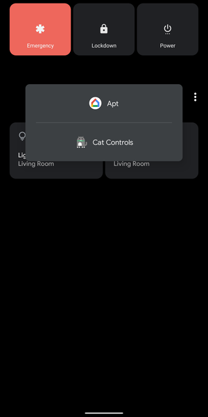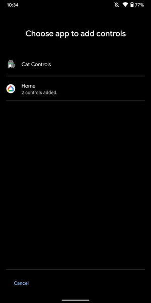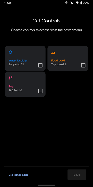 Удержав кнопку включения смартфона можно получить доступ к панели управления устройствами умного дома. В меню настройки этой панели есть пункт Add controls (добавить элементы управления), а там — See other apps (Посмотреть другие приложения), где теперь выдаётся новый пункт — Cat Controls (управление котом) с тремя элементами управления для воды, еды и игрушки, их нужно активировать. После этого в оповещениях смартфона будет появляться котик.