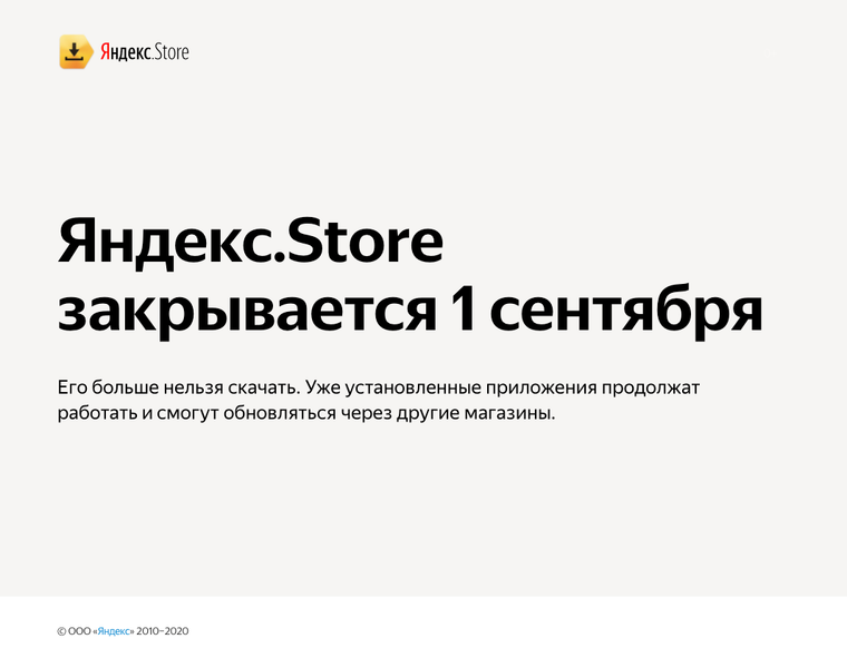 Yandex.Store прекратит свою работу 1 сентября 2020 года. С этого дня обновления и загрузки приложений из Yandex.Store станут невозможны. Кроме того, приложение Yandex.Store уже нельзя скачать с официального сайта и установить на свой смартфон.