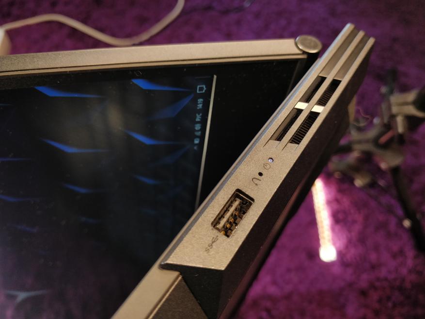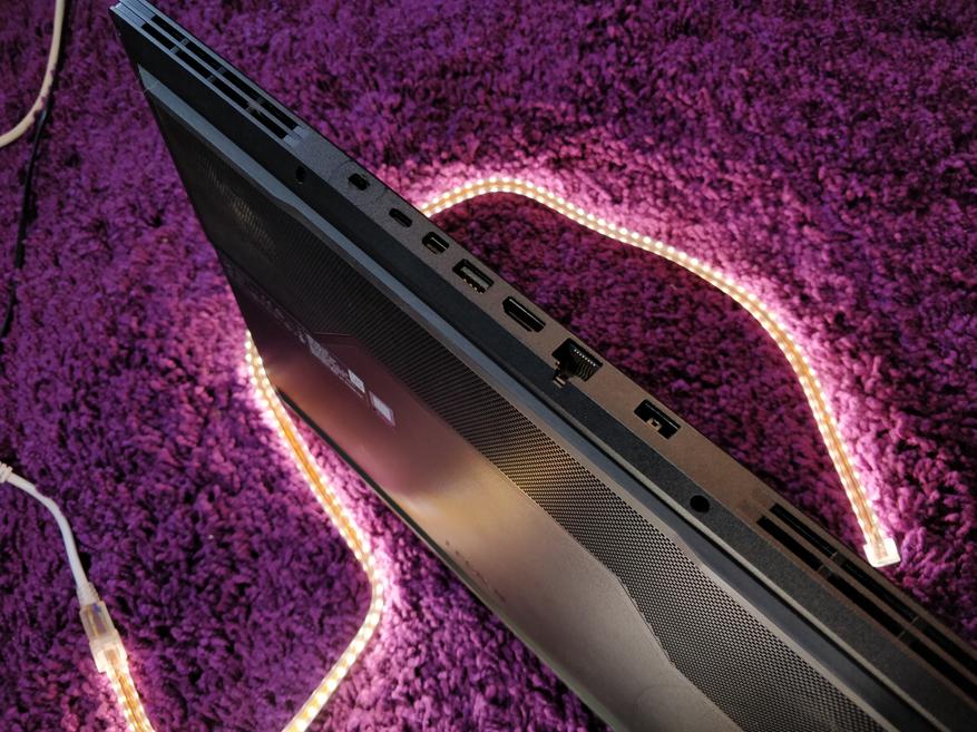 На верхней крышке ноутбука расположен логотип Legion с белой подсветкой, которая загорается во время работы ноутбука. По правую и левую стороны ноутбука почти ничего нет. Небольшие решетки для системы охлаждения, два USB и комбинированный 3,5 мм джек. Основные порты Lenovo решили разместить на задней грани девайса, что является очень весомым плюсом. Тут мы имеем USB 3.1, USB Type-C, HDMI и Mini Display Port. Данное решение позволяет спрятать почти все провода за ноутбук, не занимая лишнее пространство по бокам. Полезно и в условиях стационарного использования с большим кол-ом подключаемого оборудования, так и в портативном режиме, когда надо подключить только зарядку или HDMI.