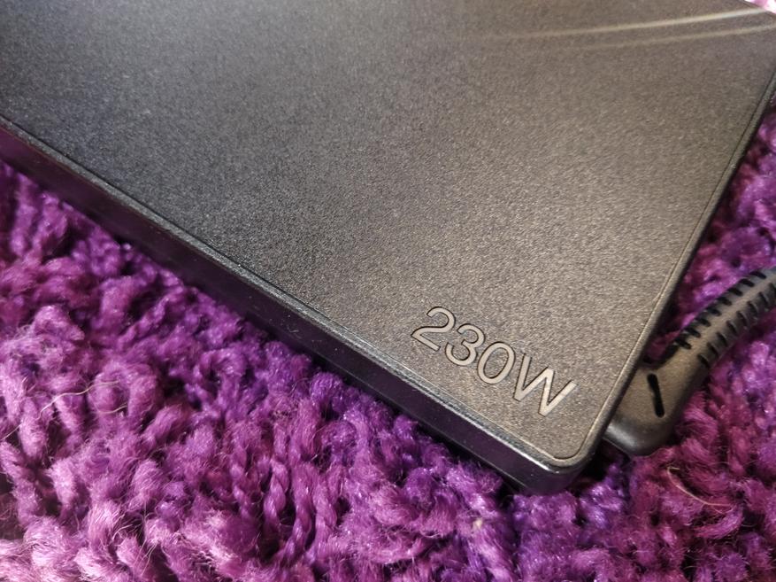 Питает такое устройство внушительный размеров блок питания на 230 Вт. Выполнен он также качественно, греется не сильно, заряжает устройство +- за 4-8 часов (зависит от нагрузки ноутбука во время зарядки)