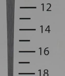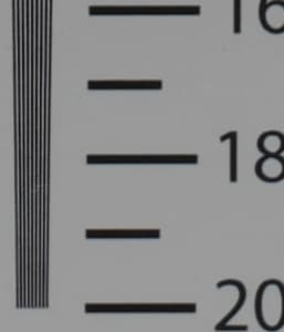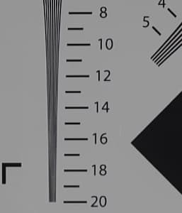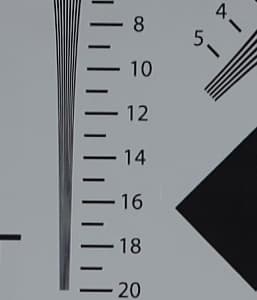 Теперь же — все, старую таблицу пора перелистывать. Разрешающая способность нашей камеры в максимальном режиме (6K, или 5888×3312) оказалась значительно выше 2000 ТВ-линий, причем как по горизонтальной, так и по вертикальной стороне кадра. Но и в 4K режиме камера дает высочайшую детализацию: линии начинают «слипаться» в районе цифры 18, что означает 1800-1900 ТВ-линий. Итог: разрешающая способность аппарата невероятно высокая. А с точки зрения оператора-любителя — пожалуй, излишне высокая. Ее никак не использовать сегодня в силу отсутствия нужных средств отображения. Конечно, остается вариант с композитингом, где требуется высочайшая детализация, но это уже вряд ли относится к любительской сфере.