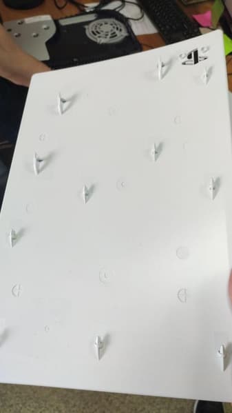Также пользователь опубликовал фото подставки для консоли – она имеет необычную конструкцию, консоли с прикрепленной подставкой и наружной панели. Хорошо видно, что последнюю легко снять и заменить на стороннюю. Или модифицировать самостоятельно – например, при помощи баллончика с краской.