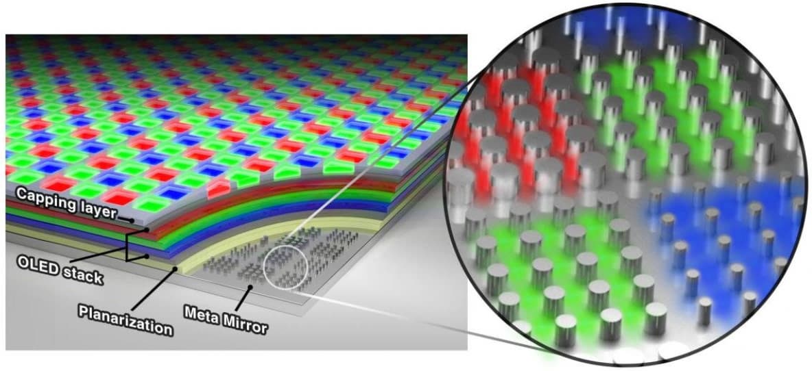 В так называемой «метафотонной» структуре панель OLED изготавливается на базовом отражающем слое из металла с наноразмерным рельефом. Эта поверхность позволять получать цвета за счет резонанса, используя способность света к отражению. Новая структура позволяет получить разрешение до 10 000 пикселей на дюйм, высокую яркость и экономичный производственный процесс.