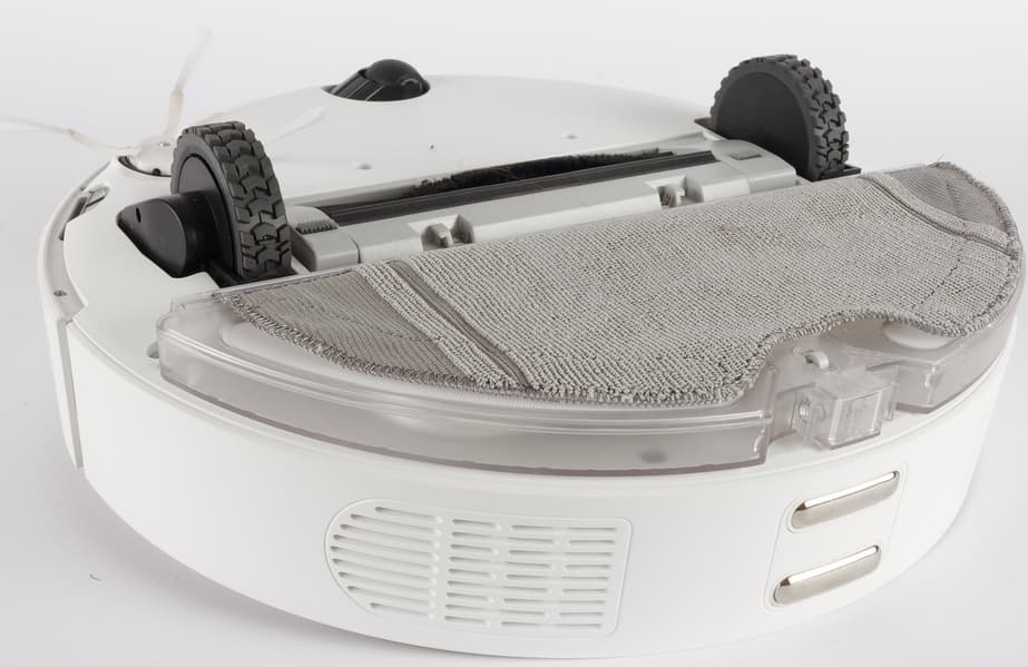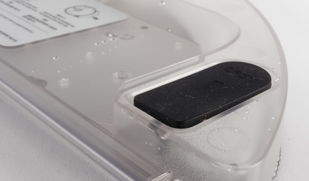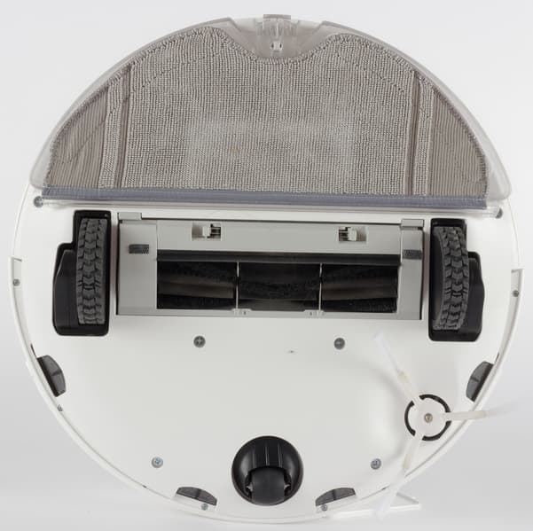 Заднюю половину нижней панели занимает съемный модуль для влажной уборки, состоящий из бака для воды и мягкой тряпки. На «корме» пылесоса выступают два металлических контакта, предназначенных для зарядки прибора.
