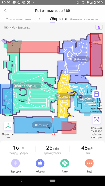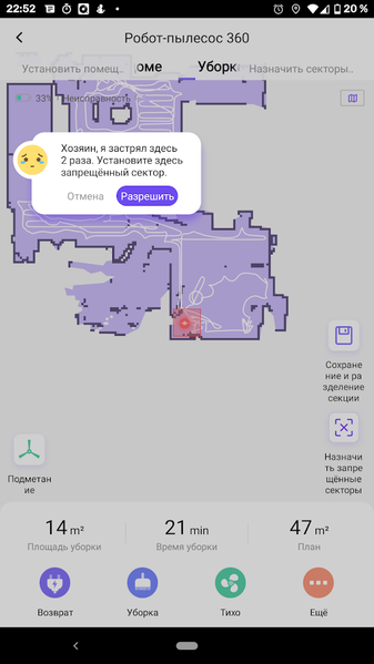 Перед запуском пылесоса руководство рекомендует убрать с пола лишние вещи, особенно провода или неустойчивые или хрупкие предметы. Однако в любой квартире остаются сложные для преодоления участки. Встречаясь с такими, 360 S7 запоминает их расположение и в случае, если затруднение движения случается два и более раза в одном месте, робот предлагает хозяину отметить проблемную зону меткой «запрещенный сектор».