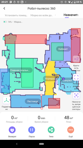 Комнаты на плане можно переименовать, используя предустановленные шаблоны, и нанести на карту участки для уборки по секторам. Внутри одного сектора можно устанавливать тщательность подметания (указав, к примеру, что для уборки кухни следует пройти по ней два раза, а в гостиной достаточно и одного прохода).