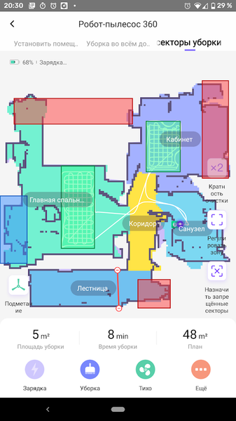 Красным цветом на карте отображаются участки, в которых пылесос не должен появляться: к примеру, пространство с неровным полом, хрупкими напольными вазами или проводами, протянутыми к системному блоку компьютера. Синие сектора — зоны, в которых запрещается влажная уборка (например, участки, покрытые коврами). Зеленым цветом можно отметить участки помещения, которые необходимо убирать более тщательно, или места, где следует производить частичную уборку. Виртуальные стены на карте квартиры проводятся красной линией — эту границу пылесос пересечь не сможет.