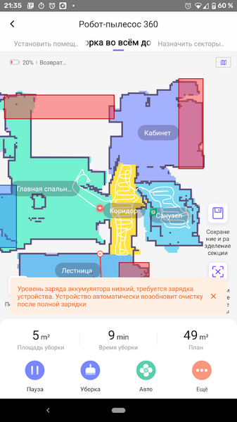 Если в процессе работы заряд аккумулятора падает до минимальных 20%, робот прерывает уборку и отправляется на базу. После того, как батарея зарядится полностью, задание будет возобновлено с той точки, где оно приостановилось. Но если к этому моменту начал действовать режим «Не беспокоить», уборка начнется только следующим утром.