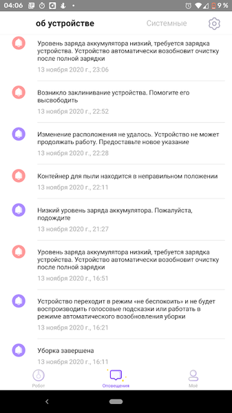 О возникших проблемах пылесос докладывает хозяину голосовым сообщением и push-уведомлением в приложении. Голос у устройства женский, с легким юго-восточным акцентом. Историю сообщений можно видеть в соответствующем разделе приложения.