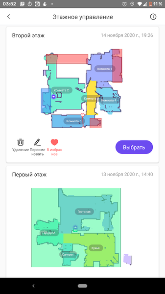 При необходимости использования двух и более карт (к примеру, в двухуровневой квартире или многоэтажном коттедже), приложение позволяет удобно переключаться с этажа на этаж без необходимости каждый раз полностью перестраивать карту помещений. А вот переносить прибор и базу все равно приходится вручную — перемещаться по лестнице он, увы, не умеет.