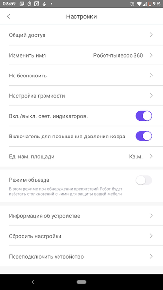 В разделе настроек можно предоставить управление пылесосом другому пользователю (например, членам семьи), установить время, в которое устройству запрещено работать, отрегулировать громкость голосовых сообщений, включить или выключить световую индикацию на корпусе, управлять некоторыми другими функциями, а также сбросить настройки до заводского состояния.
