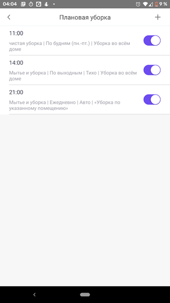 Прибор имеет гибкие настройки уборок по графику. Задания можно настраивать для будних или выходных дней, планируя в нужное время уборку всей квартиры либо отдельных ее участков. В ходе тестовой эксплуатации, к примеру, мы настроили утренний обход пылесосом всей квартиры в одиннадцать утра по рабочим дням, а в выходные, когда хочется поспать подольше, генеральная уборка начинается только в четырнадцать часов. После ужина, в девять вечера, пылесос направляется на кухню и прибирается там, пока не наступило время сна.