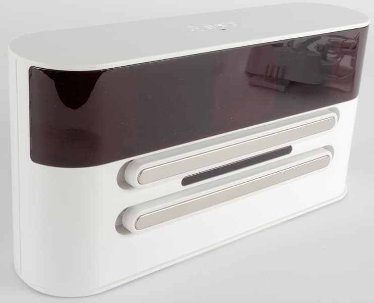 База устройства выполнена из такого же белого пластика. На ее лицевой стороне мы видим окно, закрытое ИК-прозрачным стеклом: под ним расположены датчики, облегчающие роботу поиск зарядной станции. На верхней стороне имеется окошко индикатора зарядки.