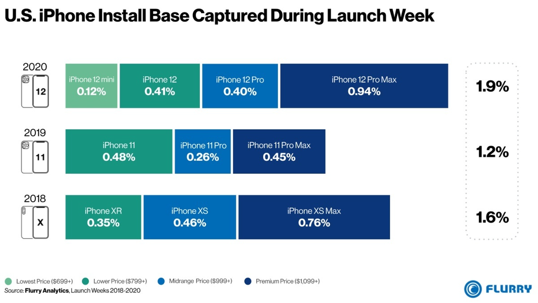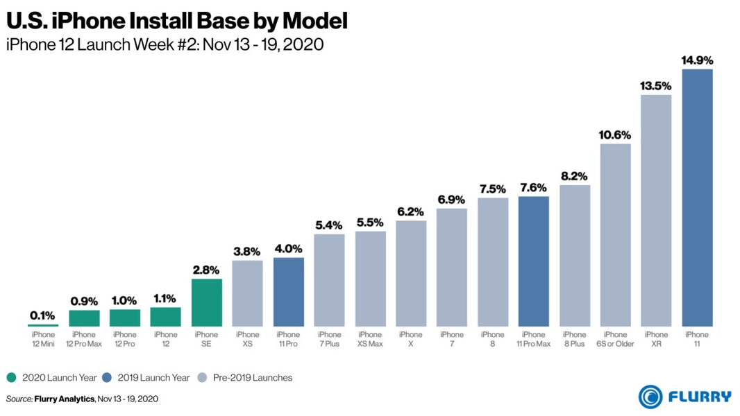 За первую неделю новые смартфоны линейки iPhone 12 составляли 1,9% от общего количества активных смартфонов Apple в США. Для сравнения: iPhone SE второго поколения смог получить 2,8% за полгода, а этот смартфон считается хитом продаж.