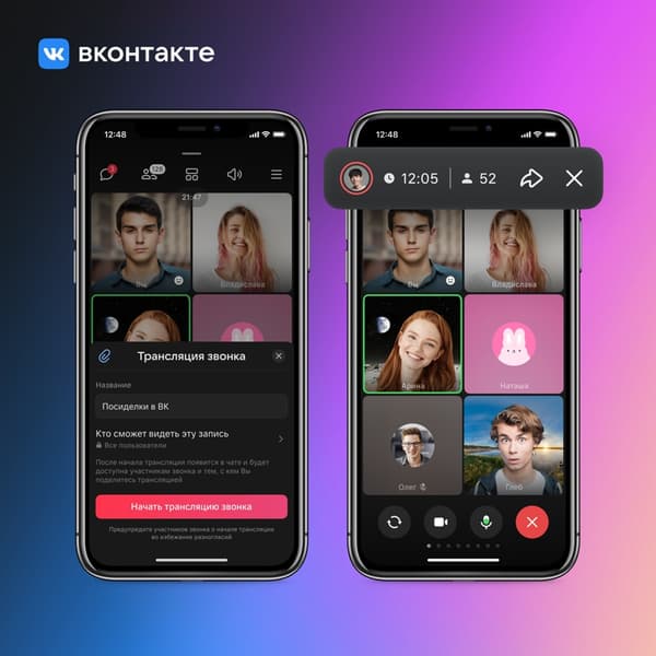 Трансляцию звонка можно запустить с компьютера и из новой версии мобильного приложения ВКонтакте. Она доступна для любого видеозвонка, независимо от количества непосредственных участников (до 128), а смотреть и комментировать трансляцию может неограниченное количество зрителей.