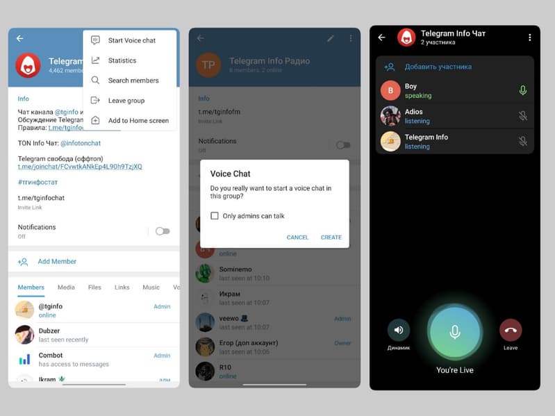В рамках такого группового аудиозвонка могут общаться все участники группы или только администраторы, этот параметр задаётся при запуске голосового чата. При этом анонимные администраторы не могут участвовать в групповом звонке.