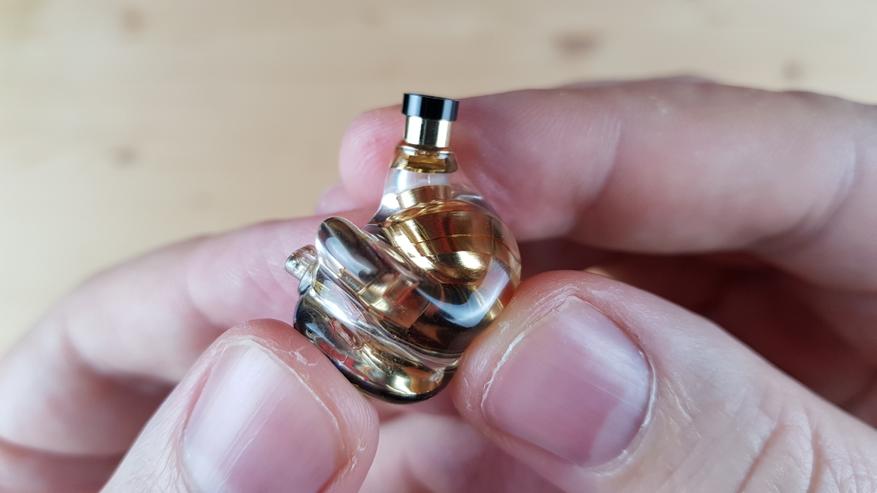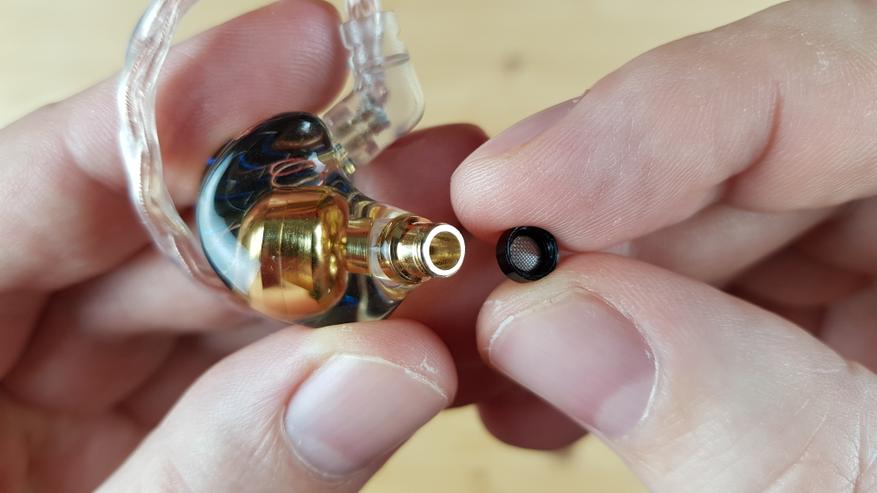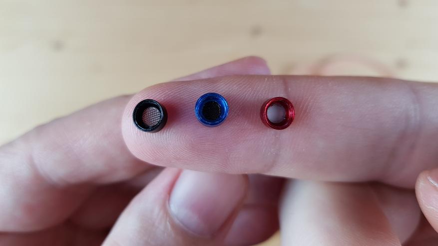 Верхняя часть звуковода здесь откручивается, чтобы дать нам возможность выбрать один из трех типов звучания: чистое детальное (черные), максимальный бас (красные) и приятное музыкальное (синие).