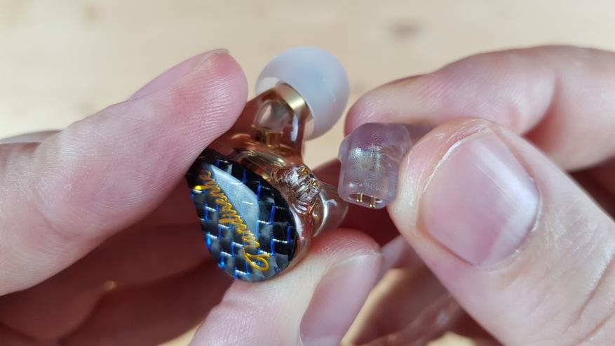 Заушины сделаны из термоусадки. А соединение с чашечками осуществляется на вилочном QDC коннекторе 0.78 мм. И, словно дежавю, штеккер полностью не закрывает пенек. Хотя и держится весьма крепко.