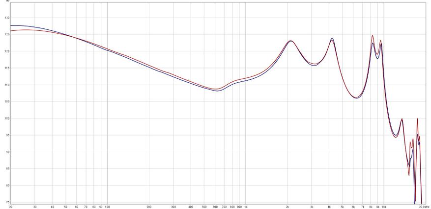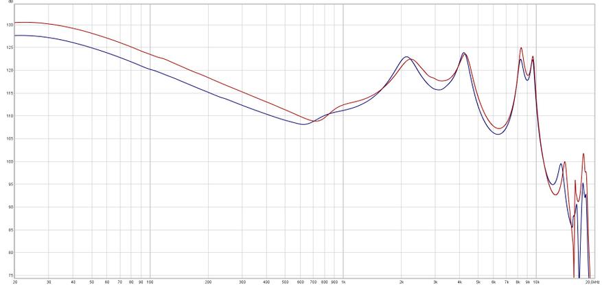 Если сравнить АЧХ TD06 (красный) и TD08 (синий), то становится очевидным небольшое ослабление уровня низких частот, чуть глубже стали минимумы, а так, действительно, очень похоже.