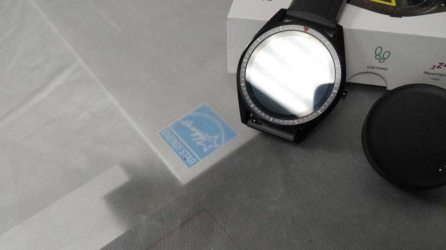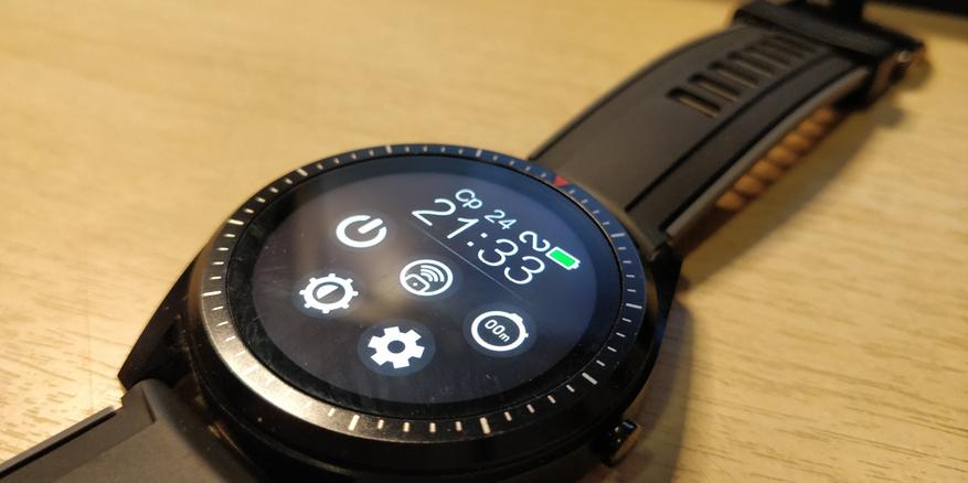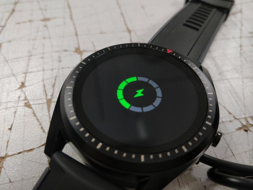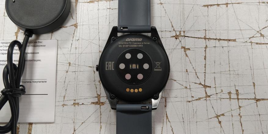Рамка у дисплея, надо признаться, толстая и за такие деньги хотелось бы видеть ее потоньше, но в это же время она грамотно вписана в общий дизайн и ее вообще не замечаешь во время повседневного использования. Вокруг дисплея начинается уже металлический корпус, окрашенный в черный цвет. Вокруг дисплея нанесены декоративные насечки и красная стрелочка, обозначающая верх дисплея. Сверху и снизу стандартные места крепления под 22 мм ремешок, справа многофункциональная кнопка. Сзади находится датчик сердцебиения и давления, вокруг него площадки для магнитов на зарядке, а под ними — сами коннекторы для восстановления заряда и прошивки устройства. Также на этой стороне устройства расположены 4 болтика, позволяющие вскрыть устройство при необходимости, однако я настоятельно не рекомендую вскрывать какие-либо устройства, ибо это (как правило) лишит их как минимум гарантии и влагозащиты, а как максимум — приведет к полной поломке устройства.