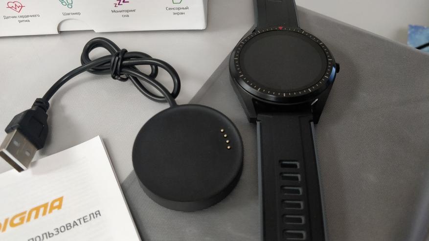 Внутри нас встречают сами часы без ремешка, под ними сам ремешок, руководство пользователя, гарантийный талон и достаточно удобная магнитная зарядка для самого устройства.