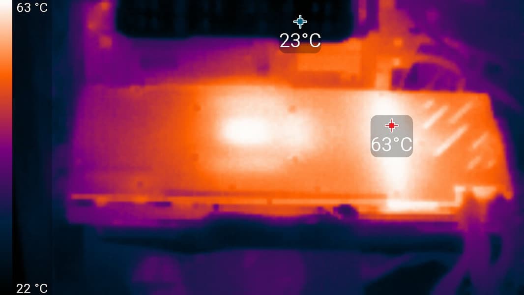 После 2-часового прогона под нагрузкой максимальная температура ядра не превысила 78 °C, что, наверное, является приемлемым результатом для видеокарт такого уровня. Максимальная мощность была зафиксирована на уровне 266 Вт, а максимальный нагрев наблюдался в центре PCB, и основными источниками нагрева являются графический процессор и преобразователи силовой цепи.