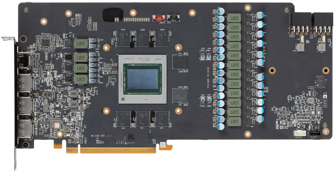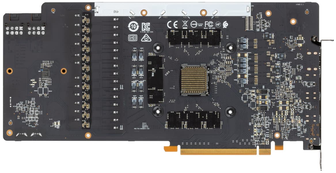 Разумеется, печатная плата очень сложная, у нее 12 слоев, включая 4 медных для улучшенного охлаждения. Также мы видим, что у карты общепринятый набор видеовыходов: 1 HDMI + 3 DP (анонсированный у референс-карты вывод USB Type-C в данном случае не используется).