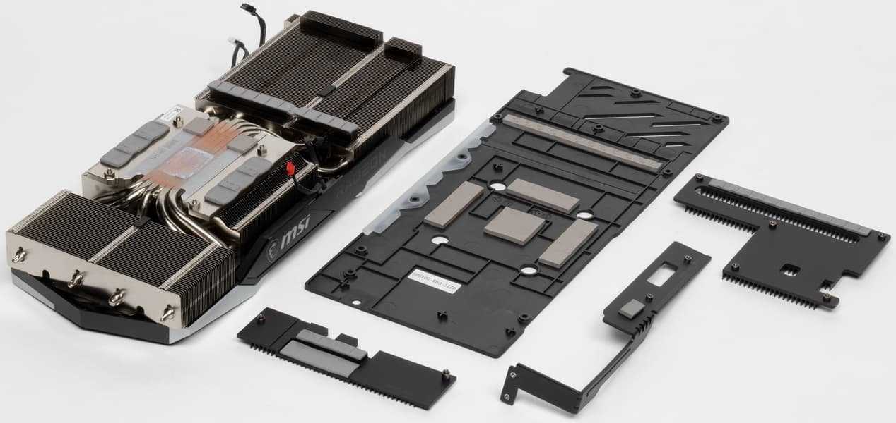 Перед нами СО Tri Frozr 2, в которую входит традиционно большой двухсекционный пластинчатый никелированный радиатор с тепловыми трубками, припаянными к никелированной подошве, контактирующей с GPU. Форма ребер и концевые направляющие помогают рассеивать потоки нагретого воздуха.