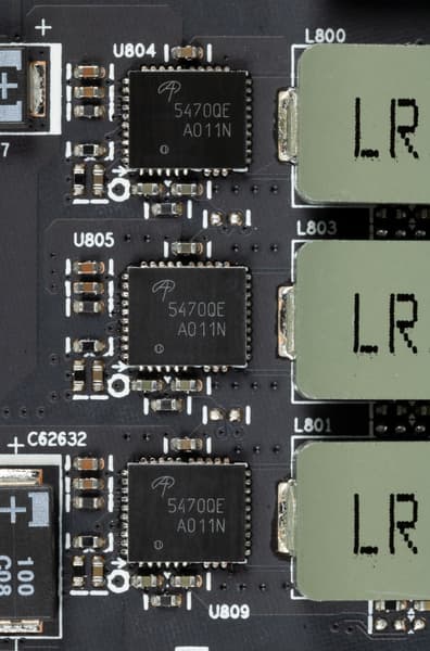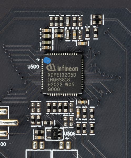 Зеленым цветом отмечена схема питания ядра, красным — памяти. 16-фазный ШИМ-контроллер XDPE132G5D (Infineon) управляет 13 фазами питания GPU (сам контроллер расположен на оборотной стороне PCB).