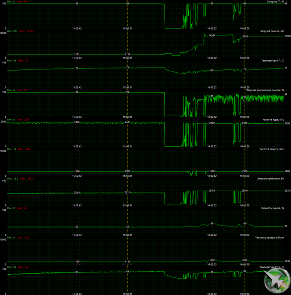 При описанном выше ручном разгоне параметры работы карты почти не менялись, максимальное потребление вырастало до 274 Вт.